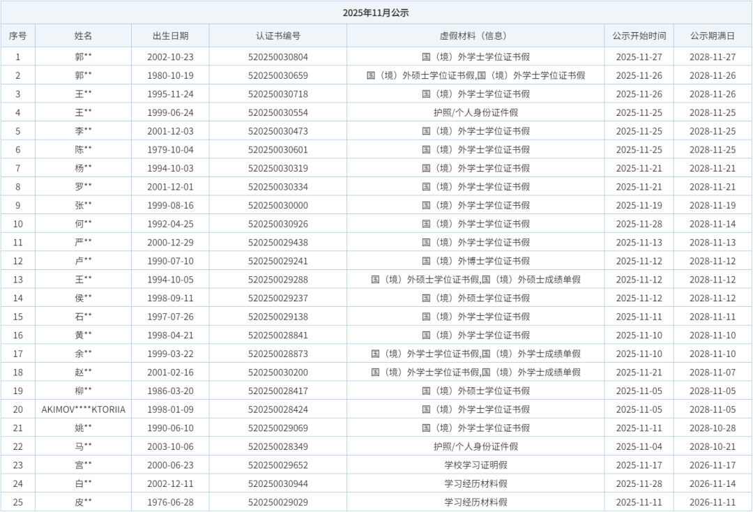 2025年11月,25名申请人因提交虚假材料(信息)获得1-3年公示期。