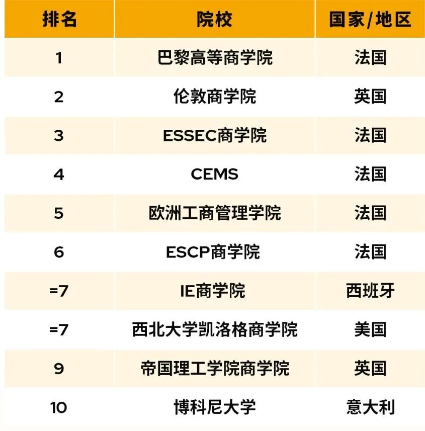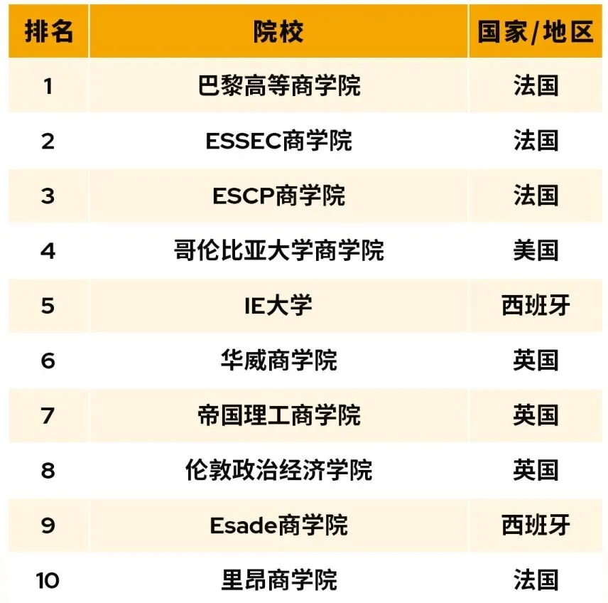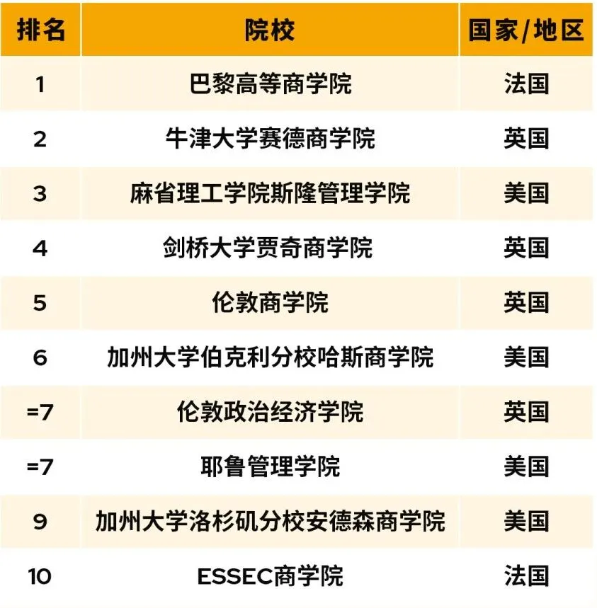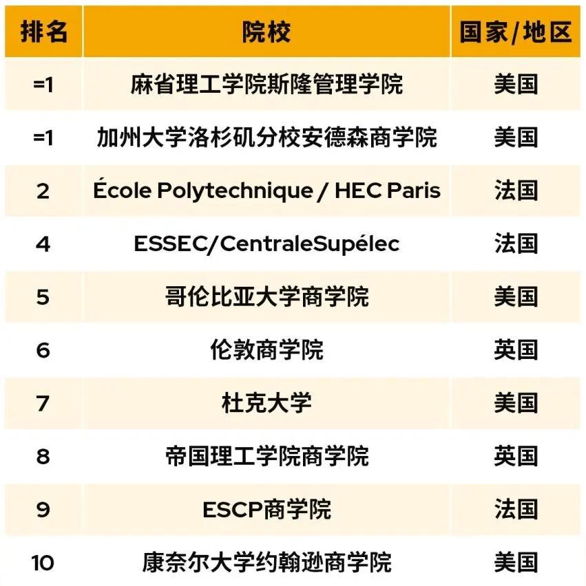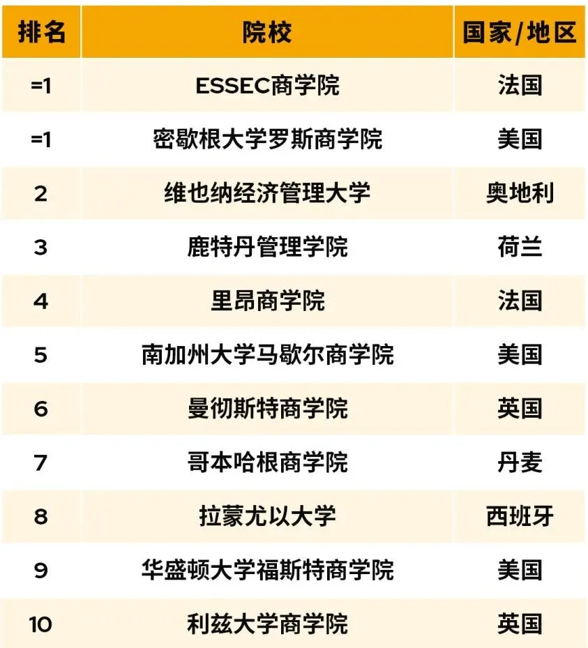 来自法国的ESSEC商学院与密歇根大学罗斯商学院并列第一。曼大商学院位列第六。