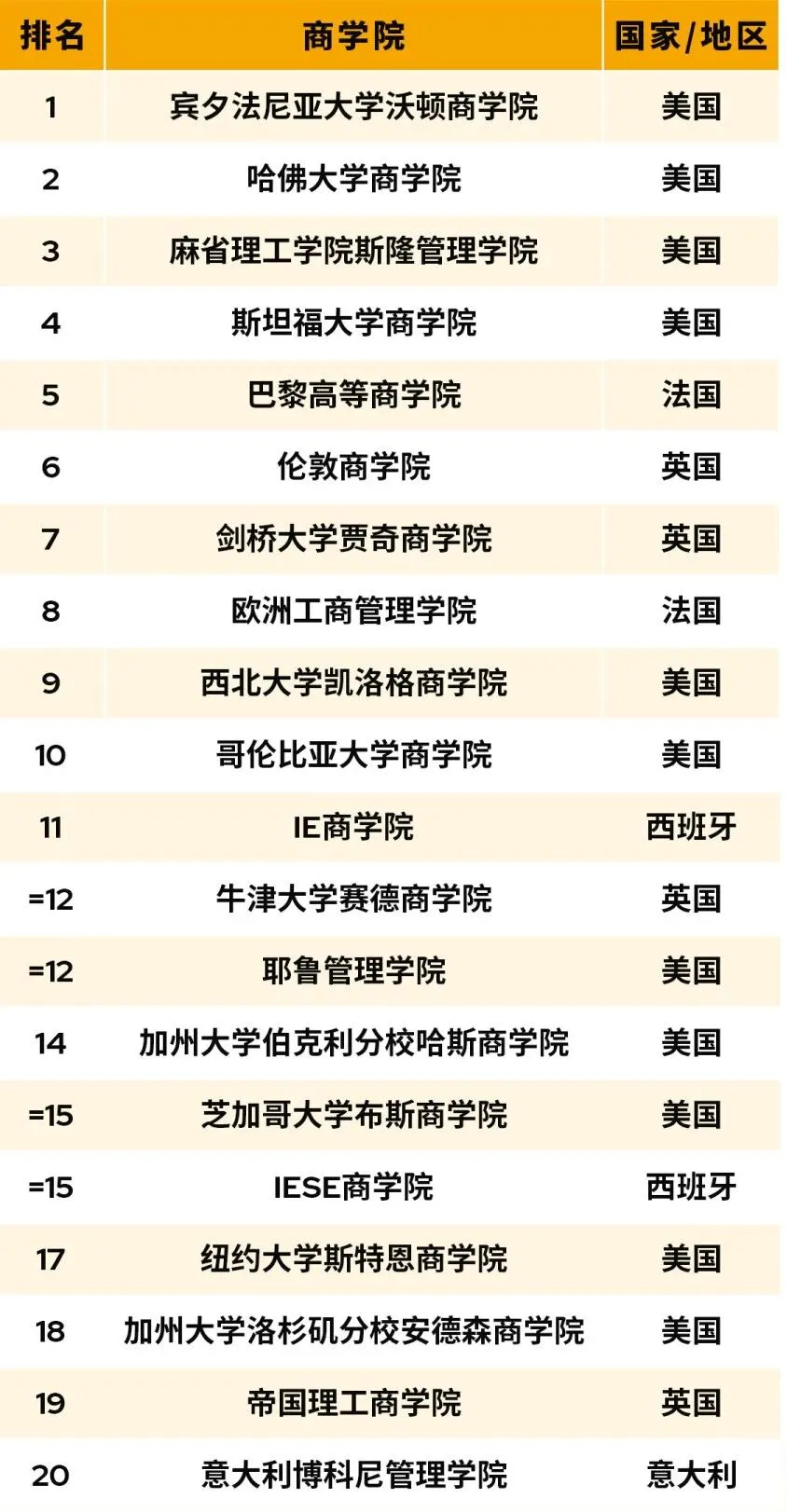 美国院校在MBA排名中依然占据主导地位,全球Top4全部被美国的商学院占据。