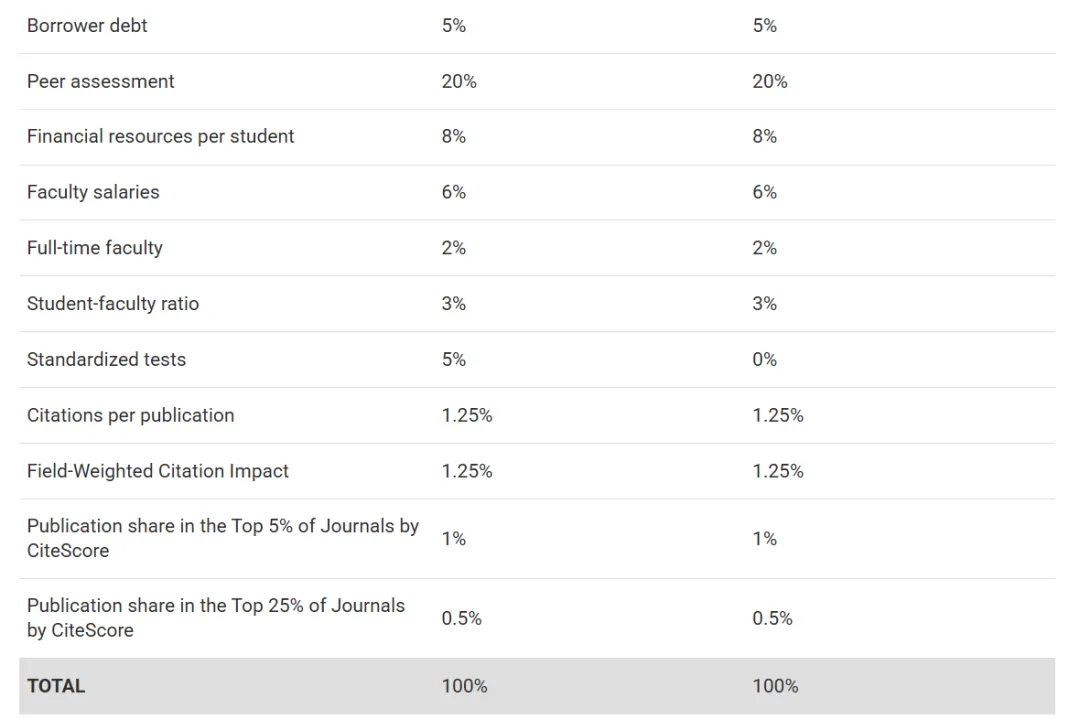 毕业生成果数据方面、排名类别方面、学生保留率、毕业生负债、毕业生收入、佩尔助学金毕业率、教师资源(包括班级规模、教师薪资和教师的学术成果等)、专家意见等。
