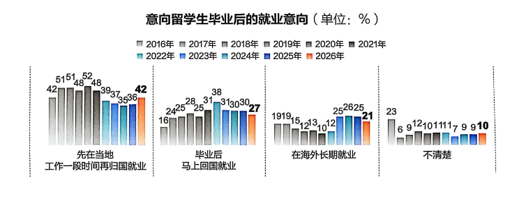 2026年,42%的意向留学生倾向于毕业后先在留学地积累工作经验,再择机回国就业。这一趋势既反映出国内就业市场对海外工作经验的认可,也体现出留学生希望通过海外实践提升竞争力,为回国发展奠定更坚实基础的长远规划。