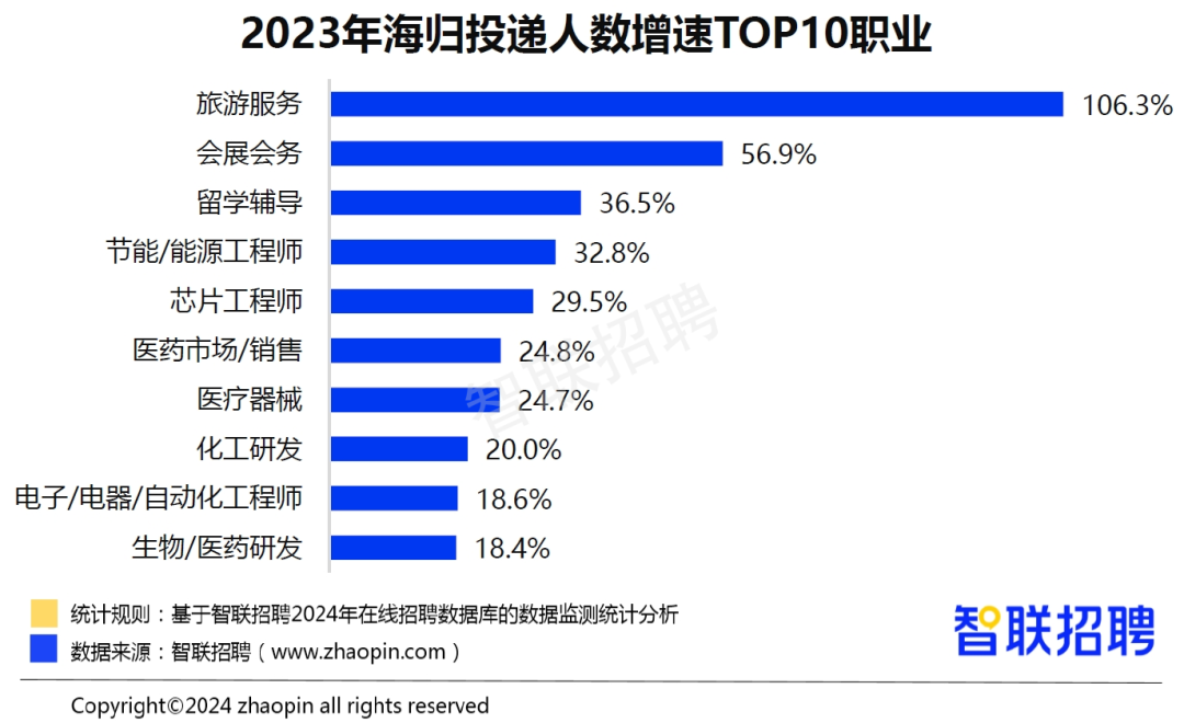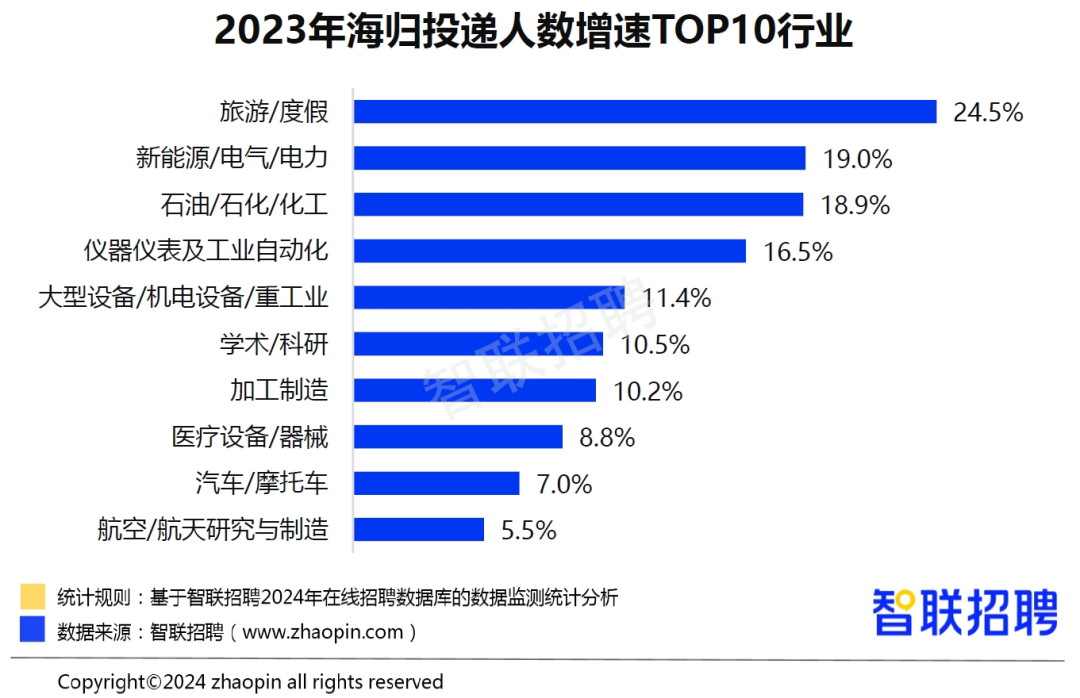 从海归求职情况看,2023年海归投递人数增速前十行业中,旅游/度假位居首位,增速24.5%,以旅游规划、旅游产品经理类岗位为主。