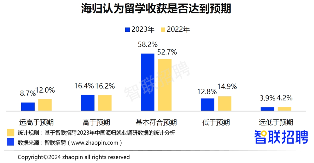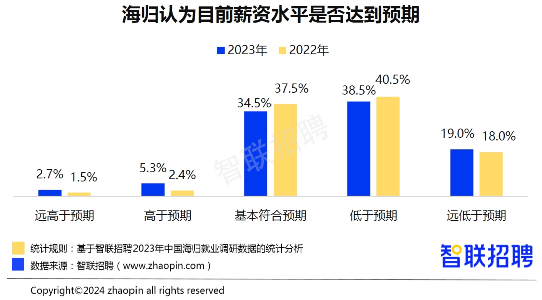 谈到薪酬时,认为目前薪资水平“高于”或“远高于”预期的海归共占8%,高于2022年的3.9%,认为基于符合预期的比例为34.5%,低于2022年的37.5%。这三项占比共计42.5%,高于2022年的41.4%。