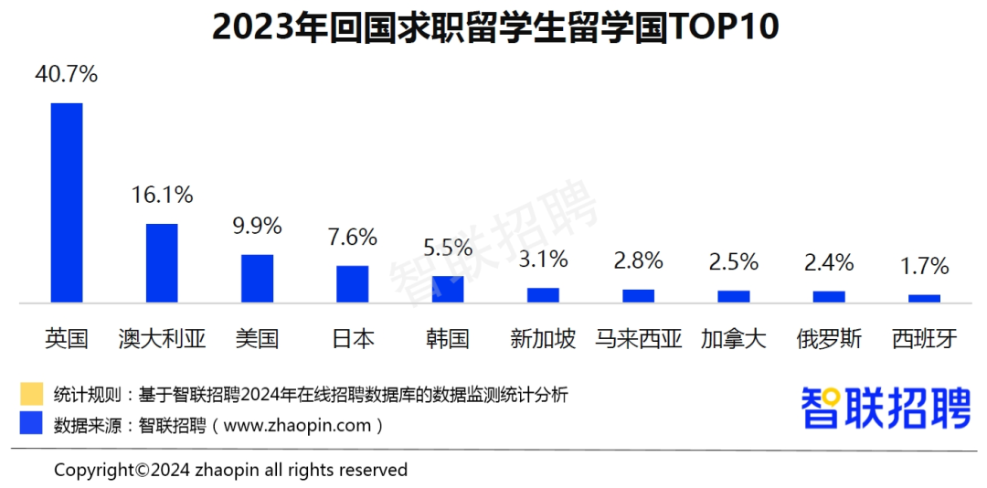 具体看回国求职留学生的留学国家分布,英国占比最高,为40.7%,其次是澳大利亚(16.1%)和美国(9.9%),排名与2021年、2022年一致。