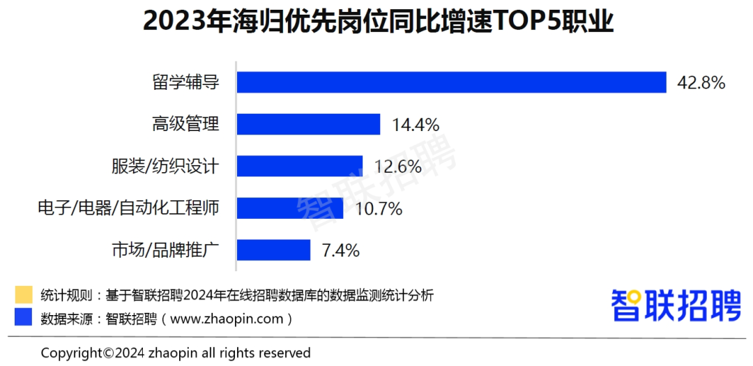 从岗位看,2023年海归优先岗位增长最快的是留学辅导,同比增速为42.8%。增速前五职业中,高级管理、服装/纺织设计、电子/电器/自动化工程师、市场/品牌推广的海归优先岗位同比增速均在10%左右。