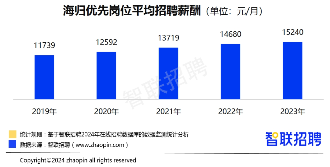 再来看看大家最看重的“薪酬福利”方面。从招聘薪酬看,海归优先岗位的平均招聘薪酬连续五年走高,2023年达15240元/月,比2022年的14680元/月增加560元,增长3.8%。