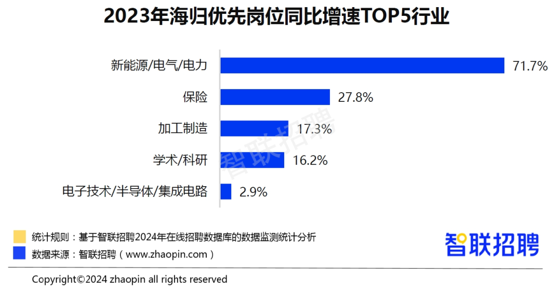 2023年,新能源/电气/电力行业的海归优先岗位比2022年大幅增长71.7%。