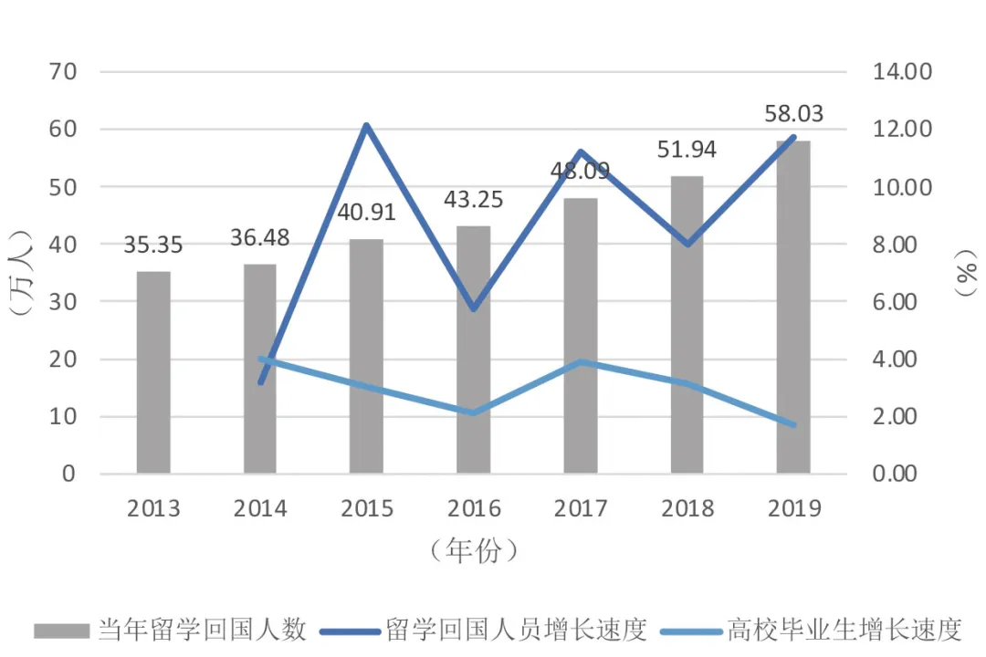 △图8:2013年-2019年留学回国人数vs当年高校毕业生人数(资料来源:留学人员数据根据教育部公开的历年《年度出国留学人员情况统计》统计;当年高校毕业生人数来自教育部每年公开的高校毕业生预计人数)