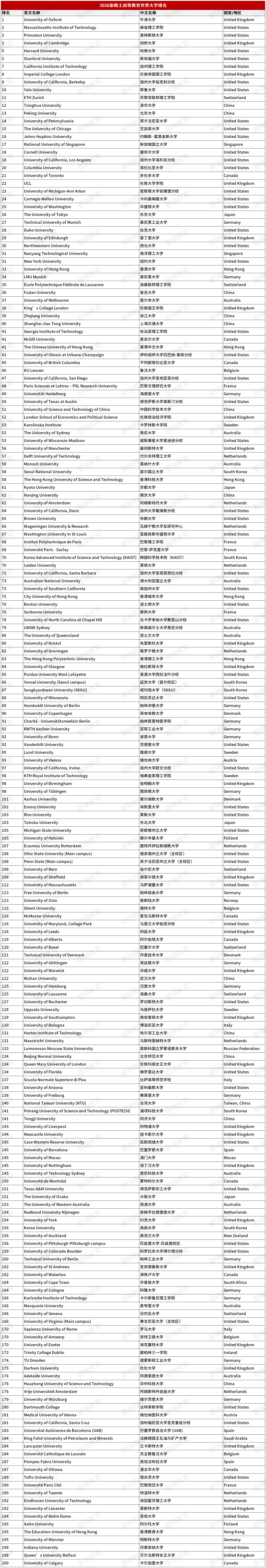 2026泰晤士高等教育世界大学排名(前1000名)