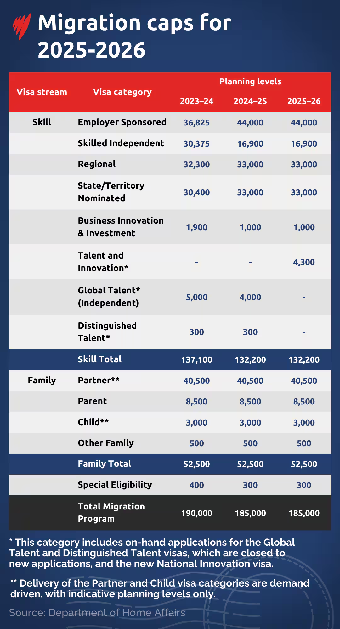 澳洲技术移民仍为政策重点。2025至2026财年,永久移民配额维持在18.5万个,其中技术移民占71%,家庭移民占28% 。