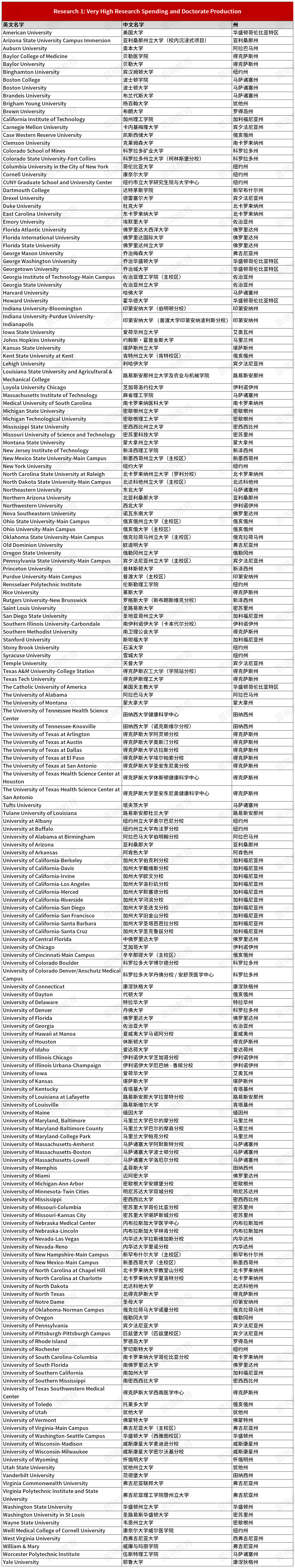 R1:研究经费支出和博士学位授予数量非常高(年均研究总支出5000万美元以上,授予70个学术型博士学位以上)。